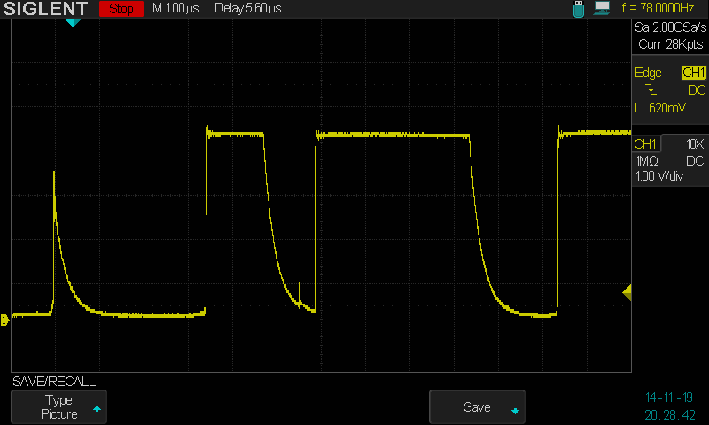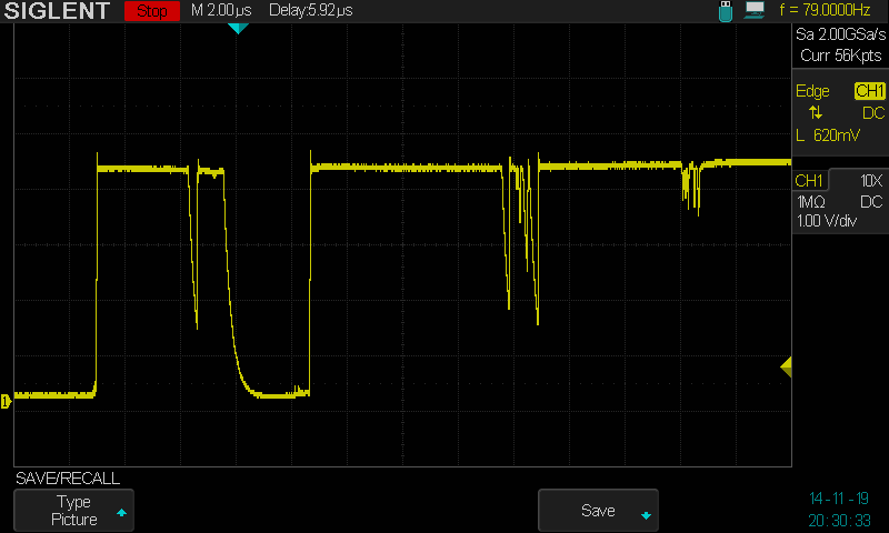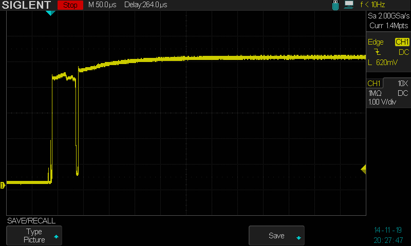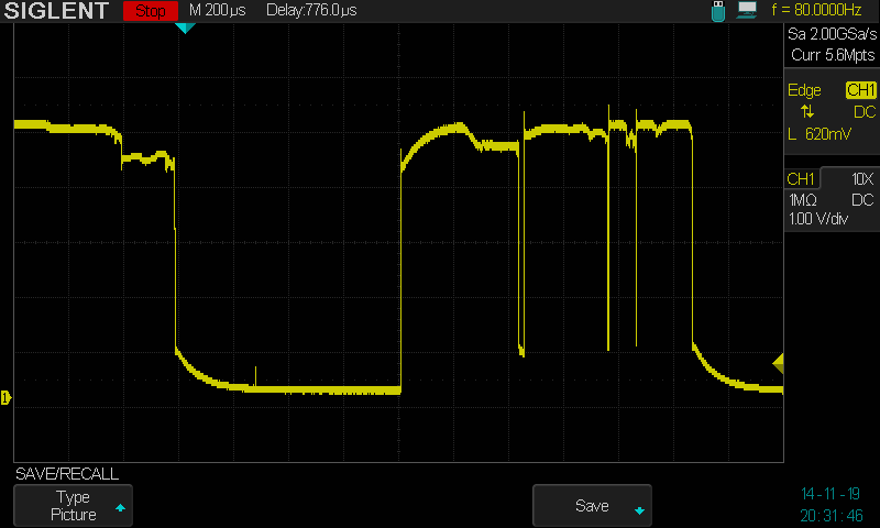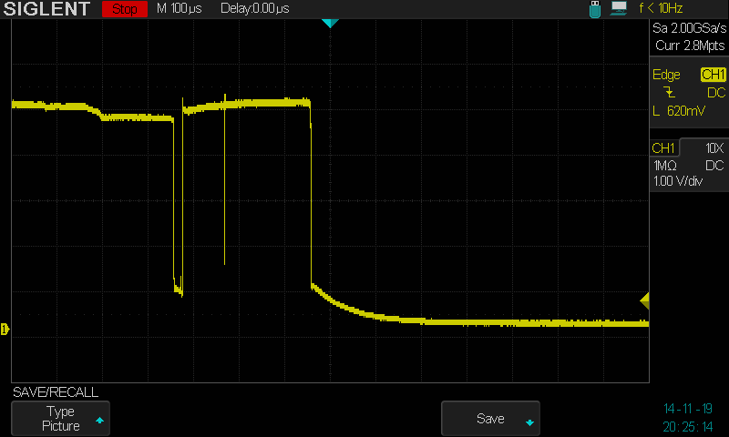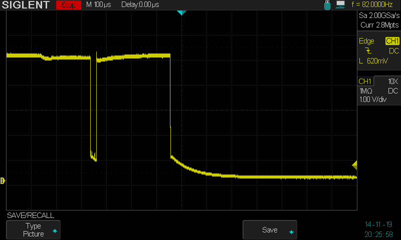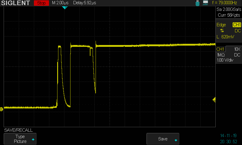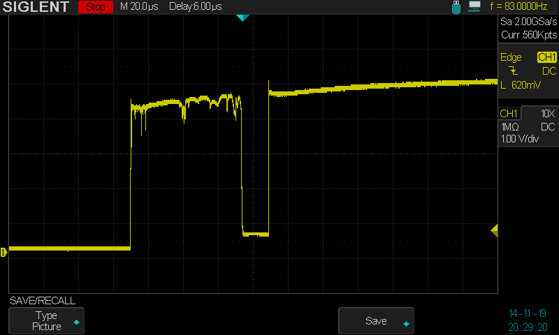 Abaixo apresentamos algumas imagens obtidas por meio de um osciloscópio digital 300MHz após a operação de uma chave mecânica simples do tipo push button em um protoboard para demonstração desse fenômeno. Com as imagens abaixo é fácil entender porque a simples contagem de transições sem debouncing em uma entrada digital conectada a um botão usualmente resulta em um número muito grande face ao número elevado de oscilações, spikes e ainda o período em que o sinal elétrico permanece na faixa de valores indefinida/indeterminada: