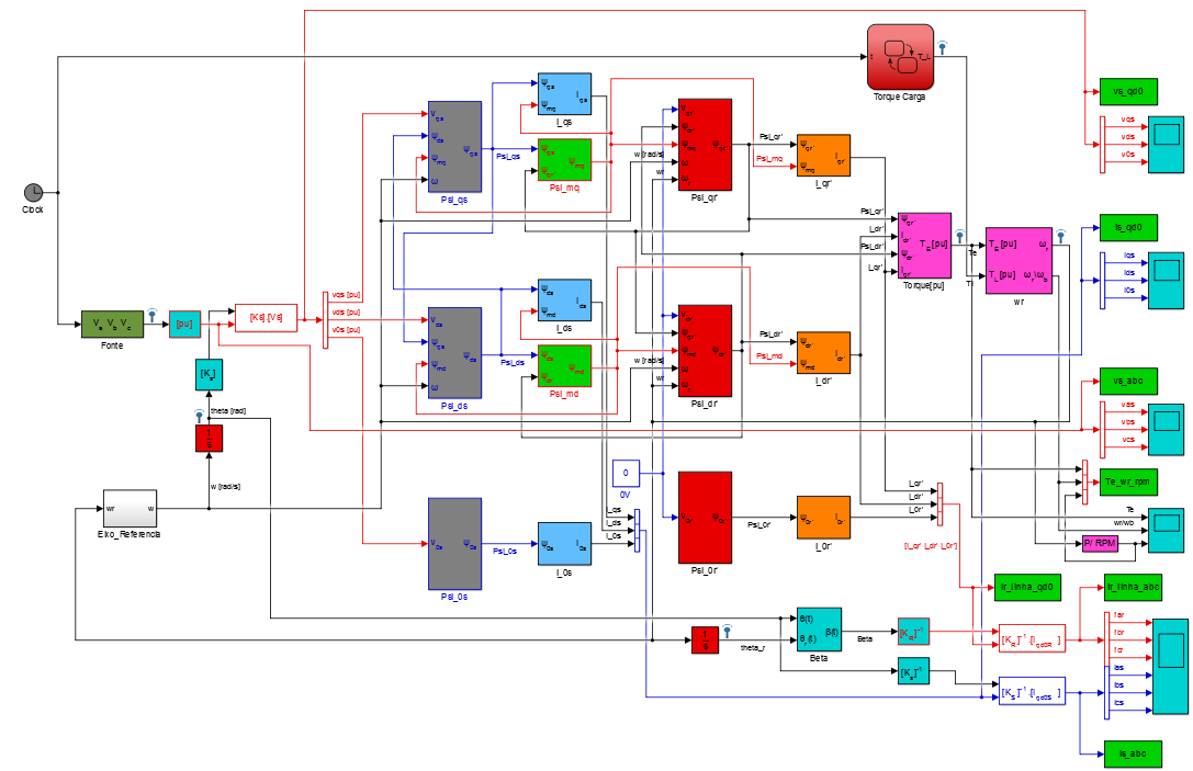 e em rosa as equações correlacionadas ao torque elétrico e velocidade angular do rotor. Os demais blocos são auxiliares e destinam-se às transformadas em si ou exportação de dados para o workspace do MATLAB.