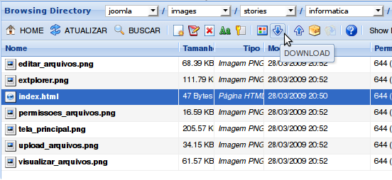 Baixar arquivos no eXtplorer é a operação mais simples: apenas selecione o arquivo desejado e clique no ícone de download, conforme a figura abaixo: