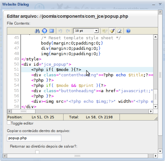 A visualização do conteúdo de arquivos de texto com o eXtplorer é muito interessante porque o software automaticamente aplica a "syntax highlighting" (coloração coerente com a semântica do texto) adequada. Nesta captura de tela temos a visualização de um arquivo PHP de um componente do Joomla: