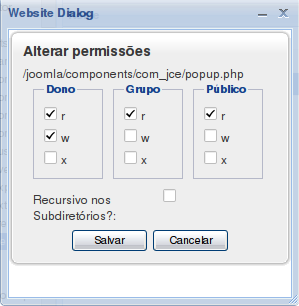 Caso o usuário utilizado pelo servidor web para acesso aos arquivos no disco rígido seja o proprietário de determinado arquivo, é possível alterar suas permissões de leitura(r), escrita(w) e execução(x) para o grupo(g), dono(u) e outros(o). Essa configuração é fundamental para a segurança de qualquer conteúdo disponível publicamente. O eXtplorer permite alterá-las através de sua interface, sem a utilização do chmod via SSH ou FTP: