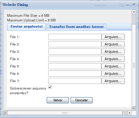 Antes de iniciar o envio de arquivos para determinada pasta, certifique-se de que o usuário do servidor web possua permissão para escrita. Esse usuário geralmente é denominado www-data. Então, clique no ícone de upload (a seta para cima, localizada ao lado do ícone para download). Neste momento, o eXtplorer nos permitirá o envio simultâneo de até 7 arquivos presentes no disco rígido ou em outro servidor: