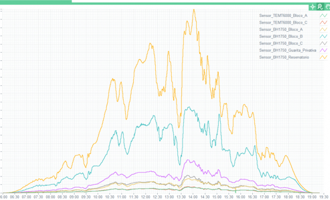 No gráfico abaixo, temos os dados registrados de quatro sensores BH1750 ao longo de um dia chuvoso. Por possuir uma grande faixa de medição, esse sensor não apresenta saturação no intervalo de medição, mesmo com sensores instalados em áreas externas protegidos apenas por uma caixa de acrílico e sob insolação direta no sensor: